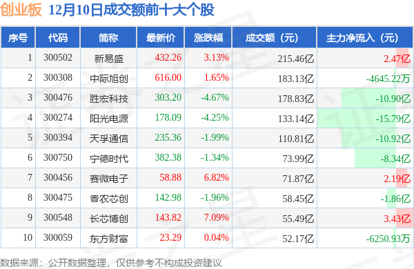 当日创业板成交额前10大个股中5只个股收涨,平均涨幅3.75%,其中新易盛(300502)以成交额215.46亿元排第一。从主力资金流入看,成交额前10大个股中有3只个股呈现主力资金净流入。