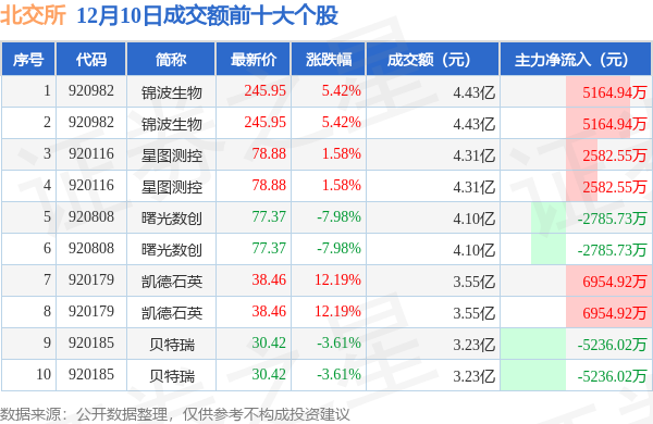 当日北交所成交额前10大个股中6只个股收涨,平均涨幅6.4%,其中锦波生物(920982)以成交额4.43亿元排第一。从主力资金流入看,成交额前10大个股中有6只个股呈现主力资金净流入。