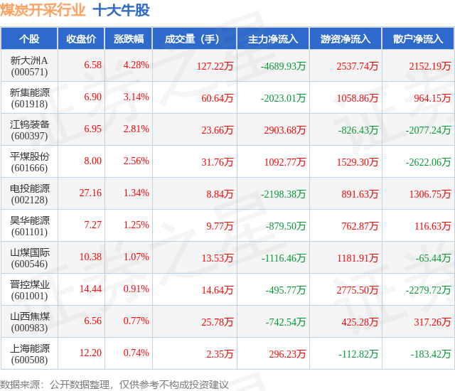 个股表现方面,煤炭开采行业当日领涨股为新大洲A(000571),该股当日报收6.58,上涨4.28%,成交量127.22万,主力资金净流出4689.93万元。新集能源(601918)以上涨3.14%紧随其后,该股当日成交量60.64万,主力资金净流出2023.01万元。除此之外,江钨装备(600397)、平煤股份(601666)、电投能源(002128)均进入当日牛股之列。具体个股列表见下表:
