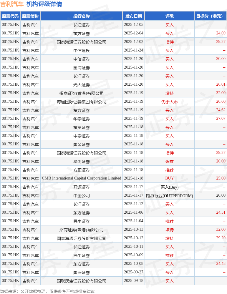 截至2025年12月10日收盘,吉利汽车(00175.HK)报收于17.68港元,上涨0.97%,成交量2986.51万股,成交额5.28亿港元。投行对该股的评级以买入为主,近90天内共有18家投行给出买入评级,近90天的目标均价为27.3港元。长江证券最新一份研报给予吉利汽车买入评级。