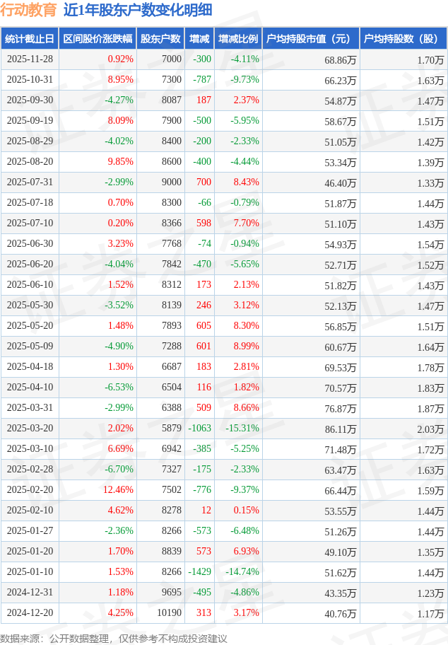 从股价来看,2025年10月31日至2025年11月28日,行动教育区间涨幅为0.92%,在此期间股东户数减少300.0户,减幅为4.11%。