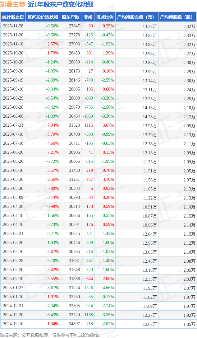 从股价来看,2025年11月20日至2025年11月28日,凯普生物区间跌幅为0.5%,在此期间股东户数增加69.0户,增幅为0.25%。