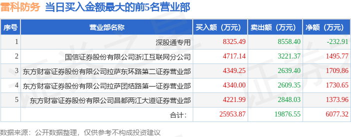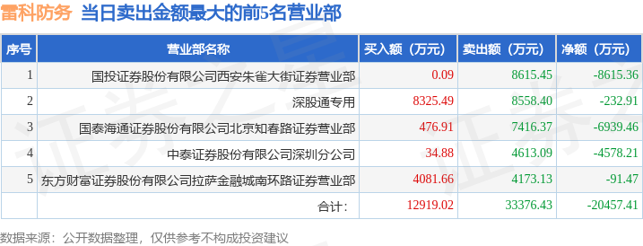 证券之星消息,沪深交易所2025年12月10日公布的交易公开信息显示,雷科防务(002413)因日跌幅偏离值达到7%的前5只证券登上龙虎榜。此次是近5个交易日内第4次上榜。