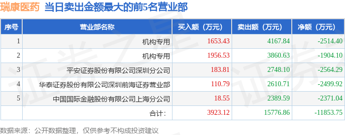 证券之星消息,沪深交易所2025年12月10日公布的交易公开信息显示,瑞康医药(002589)因日跌幅偏离值达到7%的前5只证券登上龙虎榜。此次是近5个交易日内第4次上榜。
