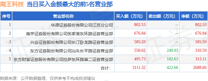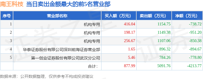 证券之星消息,沪深交易所2025年12月10日公布的交易公开信息显示,南王科技(301355)因日换手率达到30%的前5只证券登上龙虎榜。此次是近5个交易日内第1次上榜。