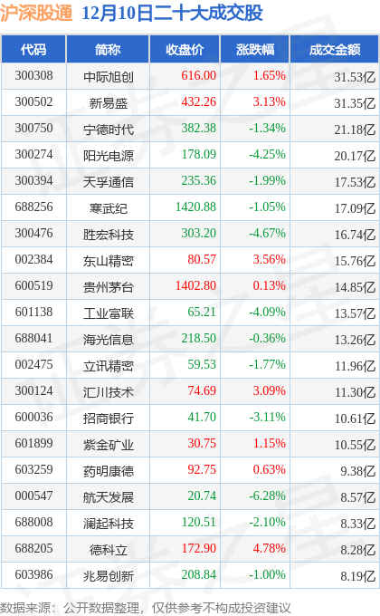 当日北向资金余额额度充足,东百集团(600693)领涨,涨幅9.98%,交易所公布的沪深股通二十大成交股中成交额前三的为中际旭创、新易盛、宁德时代,成交额分别为31.53亿元、31.35亿元、21.18亿元。详情可见下表: