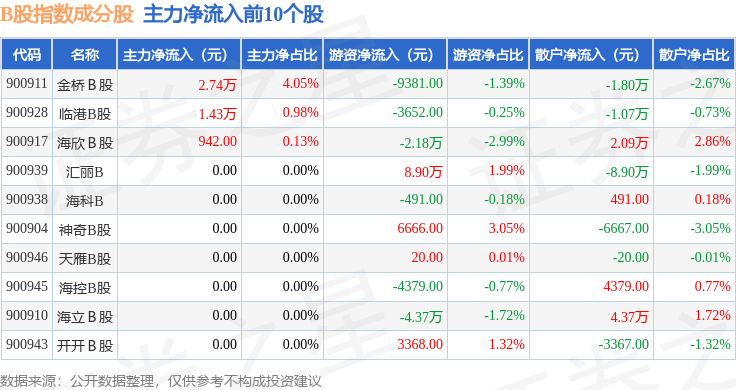 资金流向方面,B股指数(000003)成份股当日主力资金净流出合计41.61万元,游资资金净流出合计63.39万元,散户资金净流入合计105.01万元。成份股资金流向详情见下表: