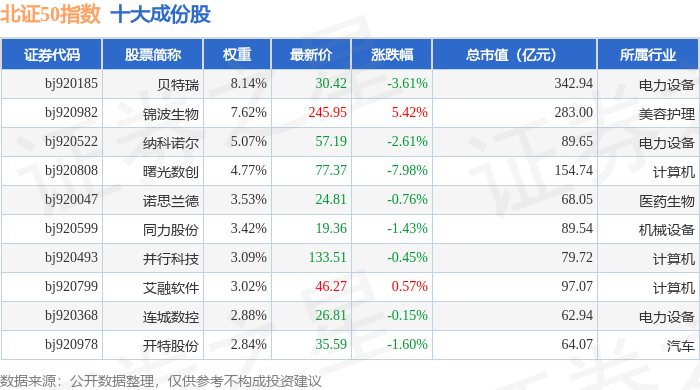 北证50(899050)指数十大成份股详情如下: