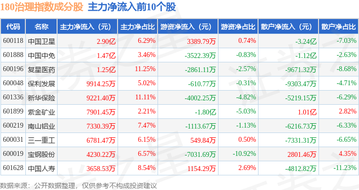 资金流向方面,180治理(000021)指数成份股当日主力资金净流出合计35.95亿元,游资资金净流入合计7.11亿元,散户资金净流入合计28.84亿元。成份股资金流向详情见下表: