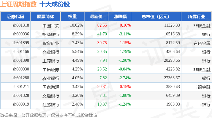 证券之星消息,12月10日,上证周期(000063)指数报收于3906.15点,跌0.59%,成交592.1亿元,换手率0.26%。当日该指数成份股中,上涨的有20家,保利发展以5.2%的涨幅领涨,下跌的有28家,招商银行以3.11%的跌幅领跌。