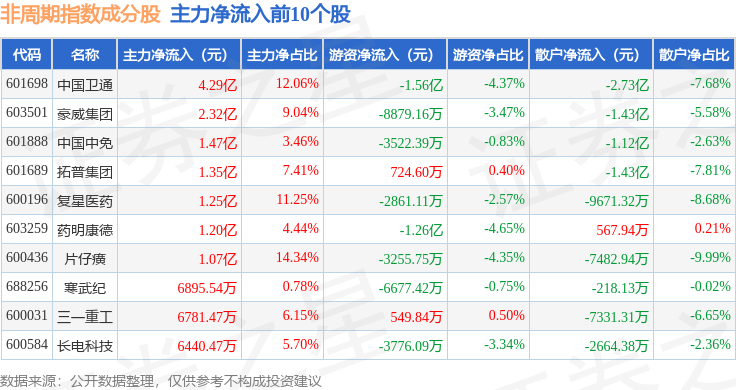 资金流向方面,非周期(000064)指数成份股当日主力资金净流出合计53.59亿元,游资资金净流入合计16.41亿元,散户资金净流入合计37.18亿元。成份股资金流向详情见下表: