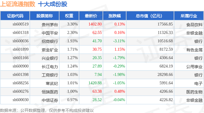 证券之星消息,12月10日,上证流通(000090)指数报收于1416.41点,跌0.01%,成交7081.7亿元,换手率1.04%。当日该指数成份股中,上涨的有1038家,霍莱沃以20.01%的涨幅领涨,下跌的有1085家,佳华科技以10.1%的跌幅领跌。