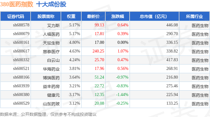 380医药(000109)指数十大成份股详情如下: