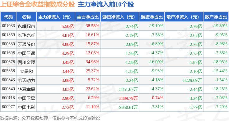资金流向方面,上证综合全收益(000888)指数成份股当日主力资金净流出合计168.12亿元,游资资金净流入合计36.19亿元,散户资金净流入合计131.93亿元。成份股资金流向详情见下表: