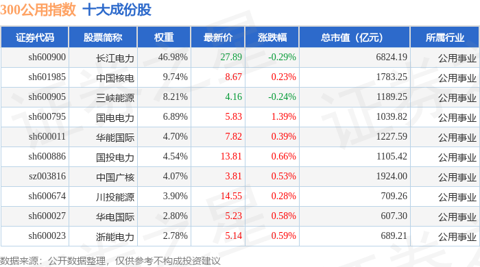 证券之星消息,12月10日,300公用(000917)指数报收于2551.1点,涨0.13%,成交51.9亿元,换手率0.31%。当日该指数成份股中,上涨的有11家,国电电力以1.39%的涨幅领涨,下跌的有2家,长江电力以0.29%的跌幅领跌。