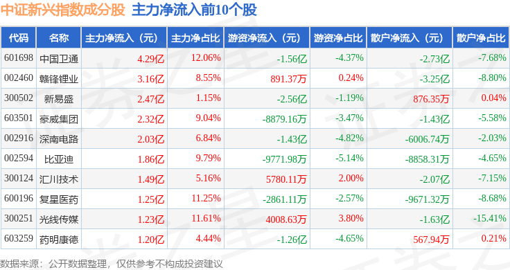 资金流向方面,中证新兴(000964)指数成份股当日主力资金净流出合计94.96亿元,游资资金净流入合计27.38亿元,散户资金净流入合计67.58亿元。成份股资金流向详情见下表: