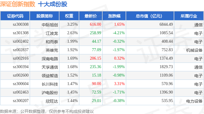 深证创新(399016)指数十大成份股详情如下: