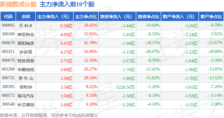 资金流向方面,新指数(399100)成份股当日主力资金净流出合计165.9亿元,游资资金净流入合计8445.5万元,散户资金净流入合计165.05亿元。成份股资金流向详情见下表: