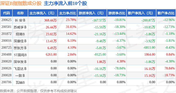 资金流向方面,深证B指(399108)指数成份股当日主力资金净流出合计156.51万元,游资资金净流出合计100.51万元,散户资金净流入合计257.03万元。成份股资金流向详情见下表: