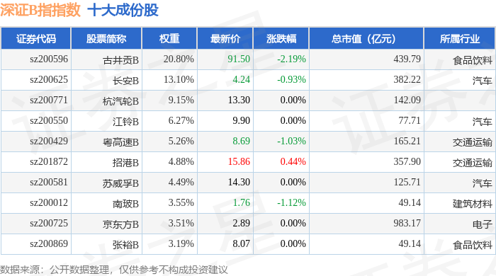 深证B指(399108)指数十大成份股详情如下: