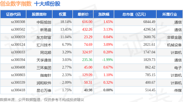 创业数字(399263)指数十大成份股详情如下: