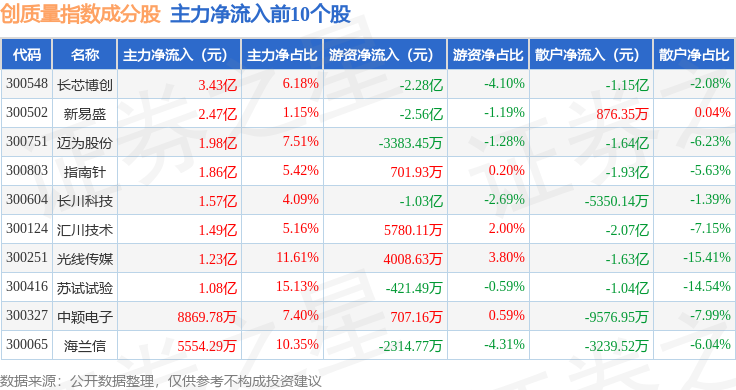 资金流向方面,创质量(399269)指数成份股当日主力资金净流出合计43.54亿元,游资资金净流入合计8.5亿元,散户资金净流入合计35.05亿元。成份股资金流向详情见下表: