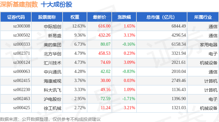 证券之星消息,12月10日,深新基建(399274)指数报收于6091.79点,涨0.91%,成交1197.43亿元,换手率1.72%。当日该指数成份股中,上涨的有35家,东山精密以3.56%的涨幅领涨,下跌的有14家,浪潮信息以2.14%的跌幅领跌。