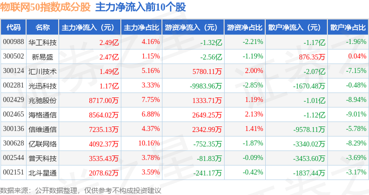 资金流向方面,物联网50(399285)指数成份股当日主力资金净流出合计14.69亿元,游资资金净流出合计9339.84万元,散户资金净流入合计15.63亿元。成份股资金流向详情见下表: