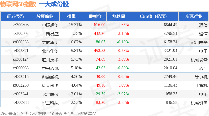 证券之星消息,12月10日,物联网50(399285)指数报收于6259.1点,涨1.03%,成交939.3亿元,换手率1.94%。当日该指数成份股中,上涨的有30家,兆驰股份以5.63%的涨幅领涨,下跌的有19家,歌尔股份以2.07%的跌幅领跌。