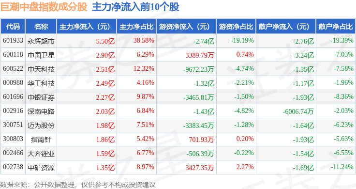 资金流向方面,巨潮中盘(399315)指数成份股当日主力资金净流出合计54.18亿元,游资资金净流入合计8.97亿元,散户资金净流入合计45.22亿元。成份股资金流向详情见下表: