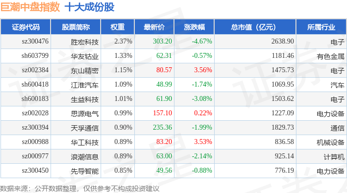 证券之星消息,12月10日,巨潮中盘(399315)指数报收于4600.78点,涨0.39%,成交2193.53亿元,换手率1.16%。当日该指数成份股中,上涨的有199家,永辉超市以10.11%的涨幅领涨,下跌的有89家,胜宏科技以4.67%的跌幅领跌。