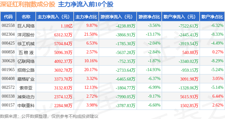 资金流向方面,深证红利(399324)指数成份股当日主力资金净流出合计5.74亿元,游资资金净流出合计1.09亿元,散户资金净流入合计6.83亿元。成份股资金流向详情见下表:
