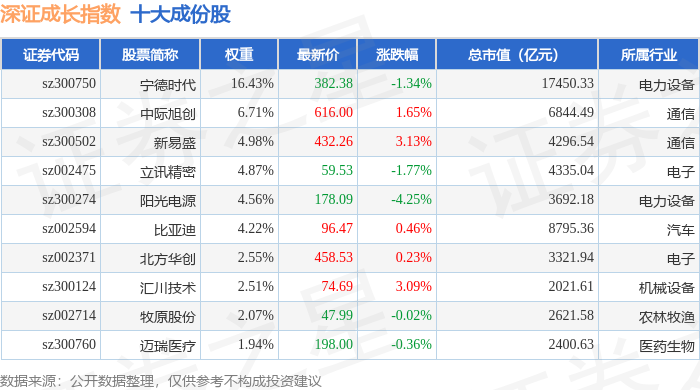深证成长(399346)指数十大成份股详情如下: