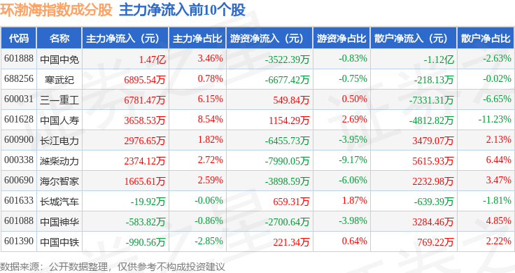 资金流向方面,环渤海(399357)指数成份股当日主力资金净流出合计31.89亿元,游资资金净流入合计12.37亿元,散户资金净流入合计19.53亿元。成份股资金流向详情见下表: