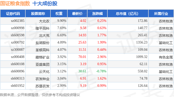 证券之星消息,12月10日,国证粮食(399365)指数报收于13343.08点,涨1.39%,成交159.59亿元,换手率2.0%。当日该指数成份股中,上涨的有36家,神农种业以20.07%的涨幅领涨,下跌的有12家,新安股份以2.22%的跌幅领跌。