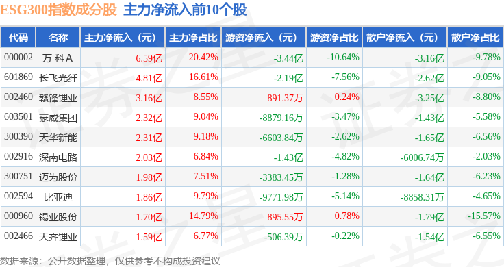 资金流向方面,ESG300(399378)指数成份股当日主力资金净流出合计113.13亿元,游资资金净流入合计23.76亿元,散户资金净流入合计89.37亿元。成份股资金流向详情见下表: