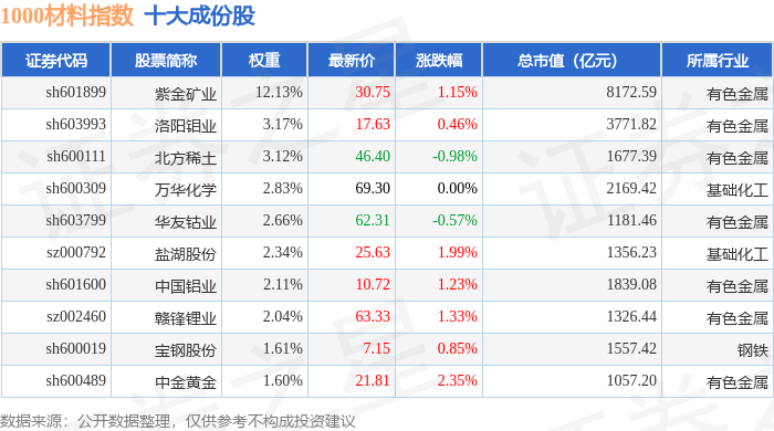 1000材料(399382)指数十大成份股详情如下: