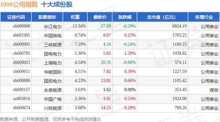 1000公用(399390)指数十大成份股详情如下: