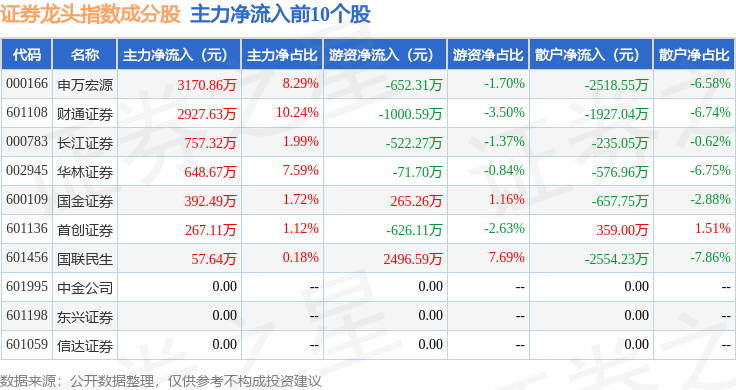 资金流向方面,证券龙头(399437)指数成份股当日主力资金净流出合计7.7亿元,游资资金净流入合计7540.67万元,散户资金净流入合计6.95亿元。成份股资金流向详情见下表: