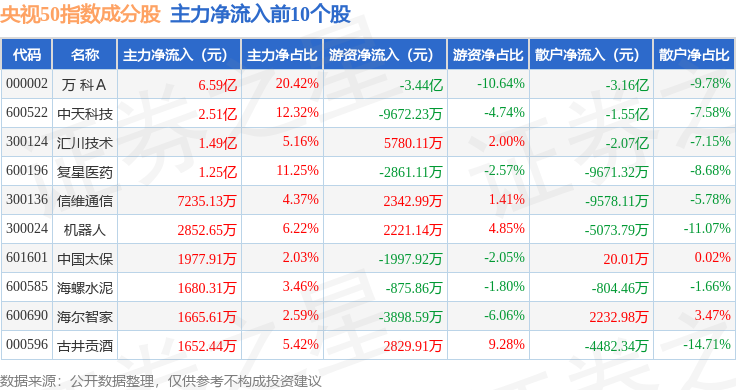 资金流向方面,央视50(399550)指数成份股当日主力资金净流出合计22.52亿元,游资资金净流入合计7.37亿元,散户资金净流入合计15.15亿元。成份股资金流向详情见下表: