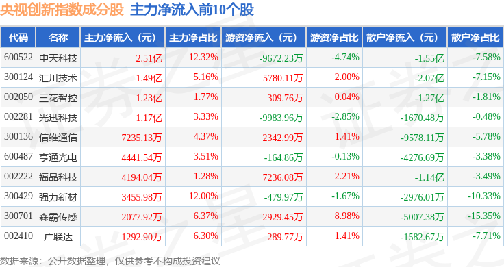 资金流向方面,央视创新(399551)指数成份股当日主力资金净流出合计33.09亿元,游资资金净流入合计11.88亿元,散户资金净流入合计21.21亿元。成份股资金流向详情见下表: