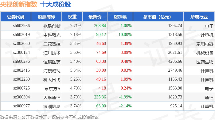 证券之星消息,12月10日,央视创新(399551)指数报收于10163.39点,跌0.39%,成交649.74亿元,换手率1.79%。当日该指数成份股中,上涨的有28家,福晶科技以5.13%的涨幅领涨,下跌的有20家,中科曙光以10.0%的跌幅领跌。