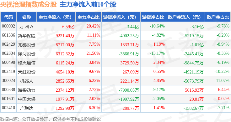 资金流向方面,央视治理(399554)指数成份股当日主力资金净流出合计20.36亿元,游资资金净流入合计7.87亿元,散户资金净流入合计12.49亿元。成份股资金流向详情见下表: