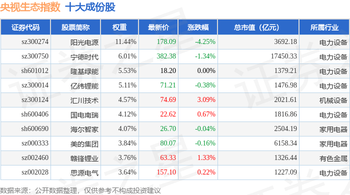 证券之星消息,12月10日,央视生态(399556)指数报收于2864.53点,跌0.28%,成交610.67亿元,换手率0.74%。当日该指数成份股中,上涨的有30家,中科环保以9.67%的涨幅领涨,下跌的有18家,阳光电源以4.25%的跌幅领跌。