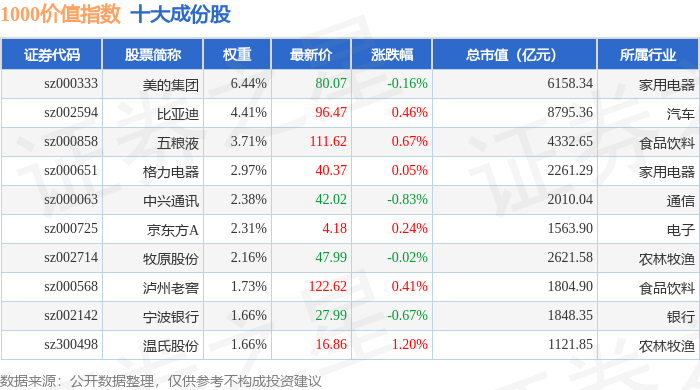 1000价值(399631)指数十大成份股详情如下:
