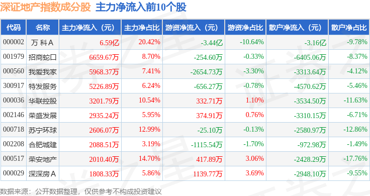资金流向方面,深证地产(399637)指数成份股当日主力资金净流入合计8.98亿元,游资资金净流出合计3.41亿元,散户资金净流出合计5.56亿元。成份股资金流向详情见下表: