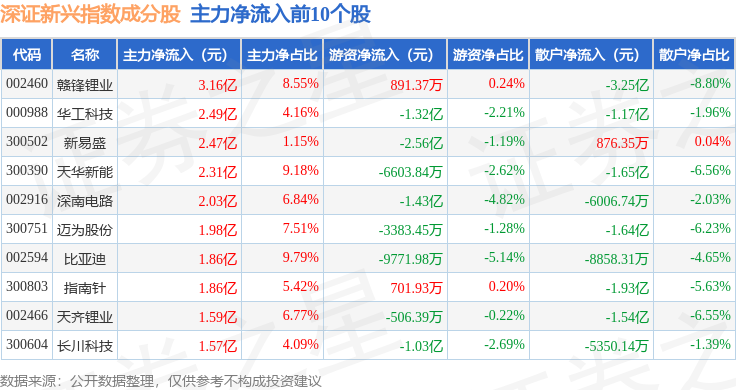 资金流向方面,深证新兴(399641)指数成份股当日主力资金净流出合计93.7亿元,游资资金净流入合计16.06亿元,散户资金净流入合计77.64亿元。成份股资金流向详情见下表: