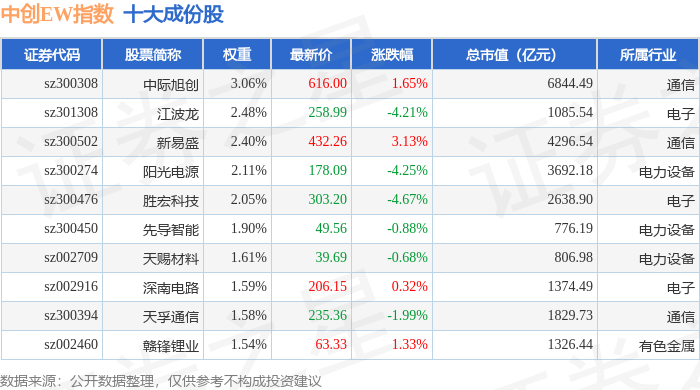 证券之星消息,12月10日,中创EW(399660)指数报收于2704.27点,涨0.0%,成交2003.12亿元,换手率1.14%。当日该指数成份股中,上涨的有63家,新诺威以8.39%的涨幅领涨,下跌的有35家,胜宏科技以4.67%的跌幅领跌。
