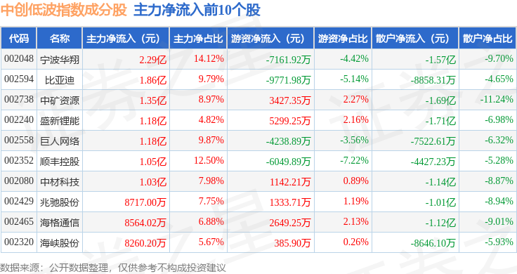 资金流向方面,中创低波(399665)指数成份股当日主力资金净流出合计25.06亿元,游资资金净流入合计6.82亿元,散户资金净流入合计18.24亿元。成份股资金流向详情见下表: