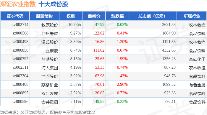证券之星消息,12月10日,深证农业(399669)指数报收于8353.02点,涨0.95%,成交179.5亿元,换手率1.13%。当日该指数成份股中,上涨的有38家,新诺威以8.39%的涨幅领涨,下跌的有10家,神州信息以3.85%的跌幅领跌。